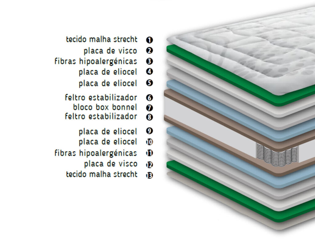 Bloco formado por molas de aço, cujo perímetro da estrutura é completamente revestido por um periférico de eliocel de alta densidade, criando uma superfície total de descanso