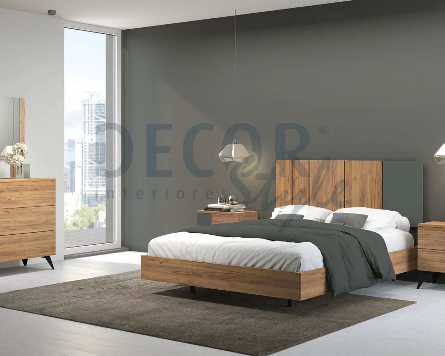 O conjunto inclui: 1 Cama de casal (p/colchão 195*150cm) + 2 Mesas de cabeceira + 1 Cómoda + 1 Espelho.