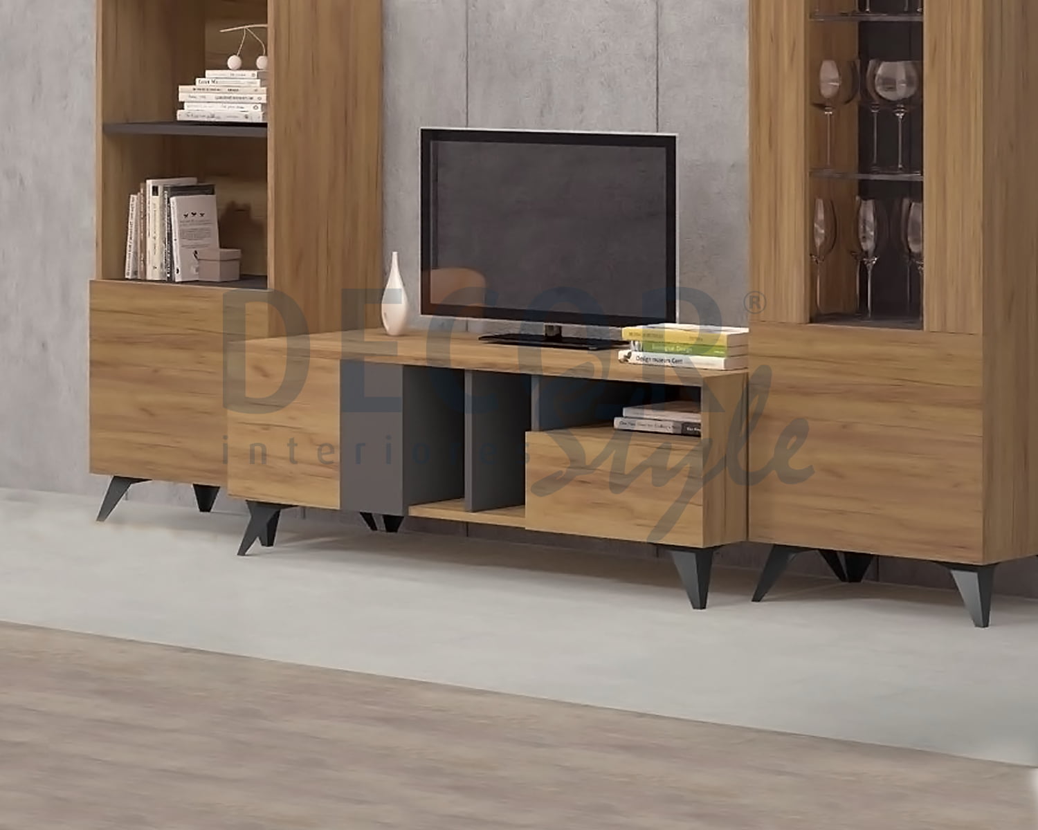 NOTA: O conjunto inclui: 1 Base TV + 1 Mesa de centro + 1 Estante + 1 Cristaleira. Disponibilidade: Após confirmação de encomenda 5 a 6 semanas (exceto período de férias).